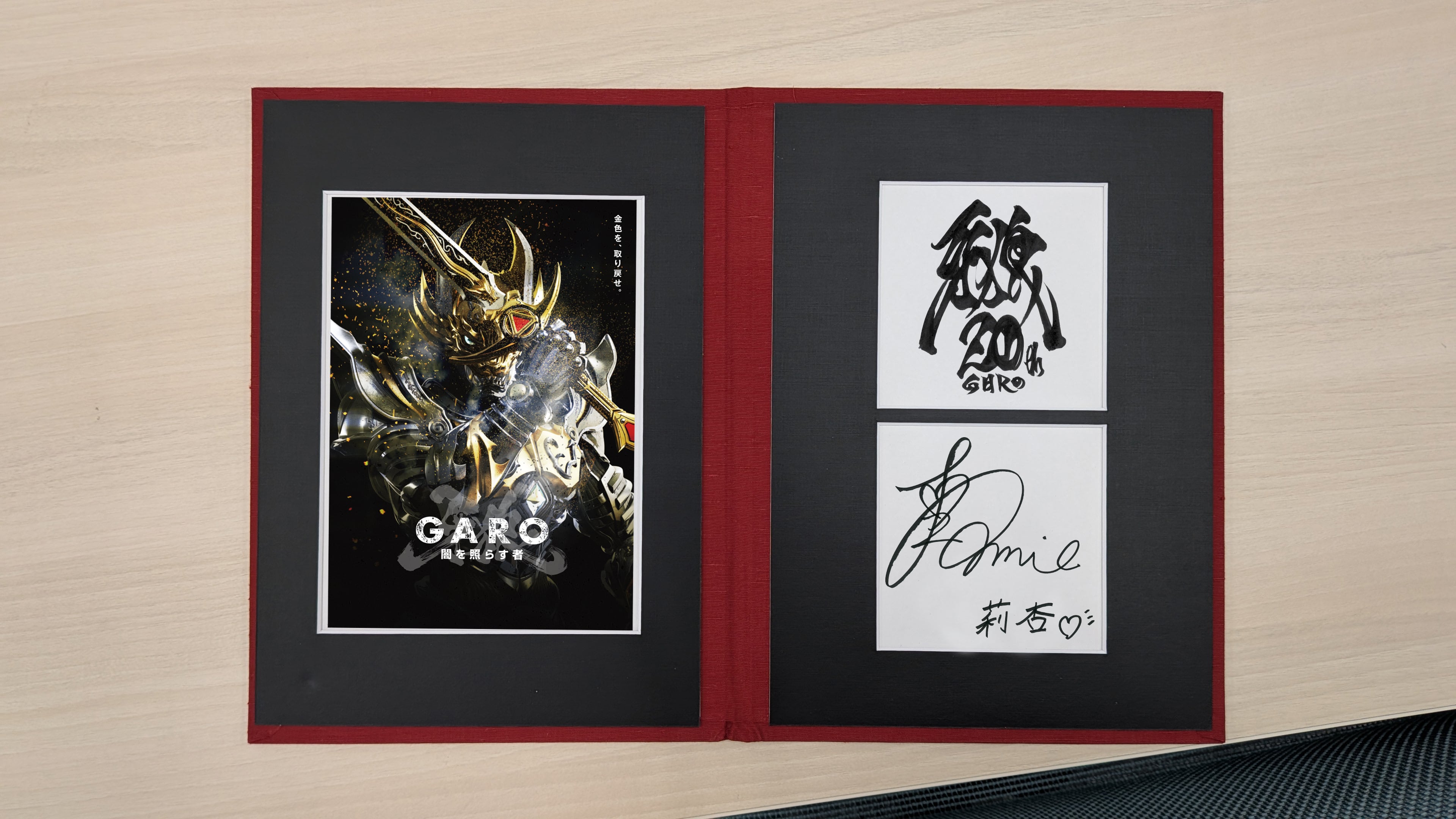 この特別なラフネートルには、南里美希さん牙狼初出演作品である『牙狼<GARO> ~闇を照らす者~』のポスターと。そして、そこには、牙狼<GARO>シリーズファンへの熱い感謝を込めて南里美希さんのメンバーにご寄稿いただいたサインを印刷で収録されています。